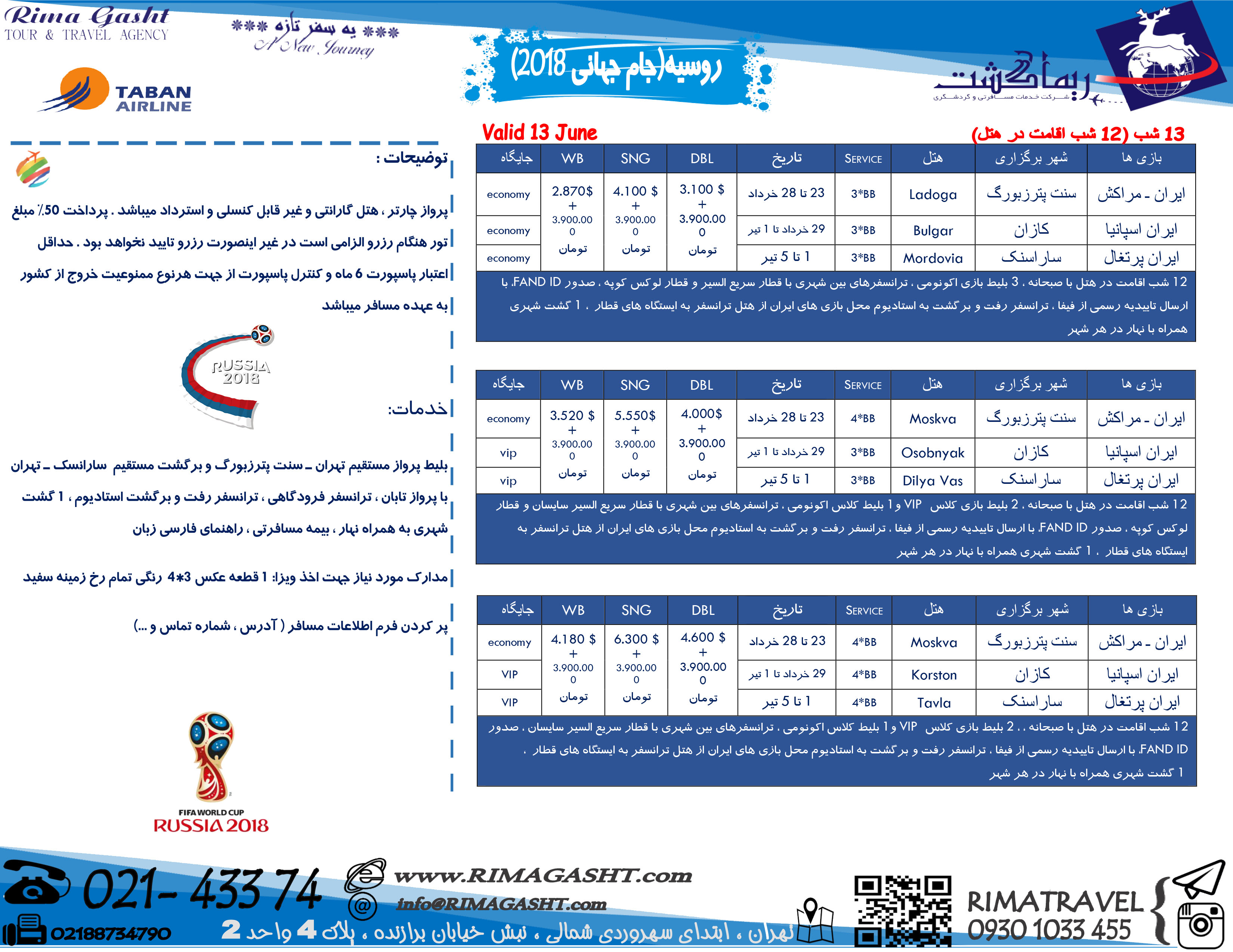 12 شب اقامت در هتل با صبحانه ، پرواز ، ترانسفر فرودگاهی ، 3 بلیط کلاس اکونومی ، ترانسفر های بین شهری با قطار سریع السیر سابسان ، صدور FAN ID با ارسال تاییدیه رسمی از فیفا ، ترانسفر رفت و برگشت به استادیوم محل بازی های ایران از هتل ، ترانسفر به ایستگاه های قطار ، بیمه مسافرتی ، 3 گشت شهری همراه با نهار در شهر ، راهنمای فارسی زبان